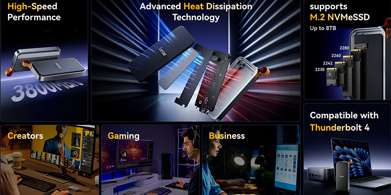 Box di động SSD M.2 NVMe 40Gbps Lexar E750 LPAE750-RNBNG hỗ trợ giao thức USB4 tương thích Thunderbolt 4, mang lại hiệu suất truyền tải dữ liệu lên đến 3800MB/s. Với tốc độ này, người dùng có thể tải lên và sao lưu dữ liệu nặng trong thời gian ngắn, lý tưởng cho sáng tạo nội dung, dựng phim, công việc kỹ thuật số hoặc di chuyển file dung lượng lớn.
