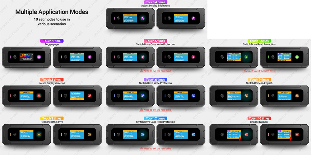 Box di động SSD M.2 PCIe NVMe Gen3x4 / Gen4x4 JEYI Panther Pro đmang đến trải nghiệm linh hoạt hơn với khả năng quản lý dữ liệu thân thiện với người dùng thông qua 10 mode hiển thị cho màn hình cảm ứng.