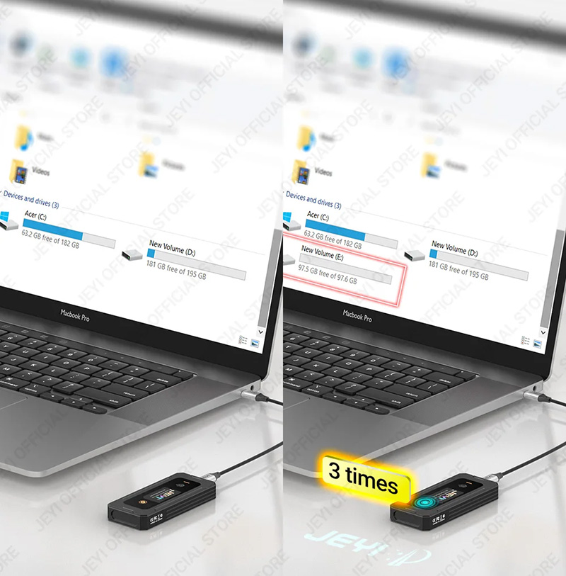 Box di động SSD M.2 PCIe NVMe Gen3x4 / Gen4x4 JEYI Panther Pro đơn giản hóa việc quản lý ổ cứng với khả năng kết nối lại nhanh chóng. Chỉ cần nhấn ba lần vào màn hình là bạn đã có thể kết nối lại mà không cần rút cáp.