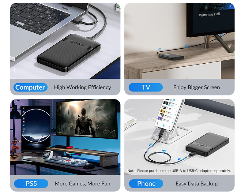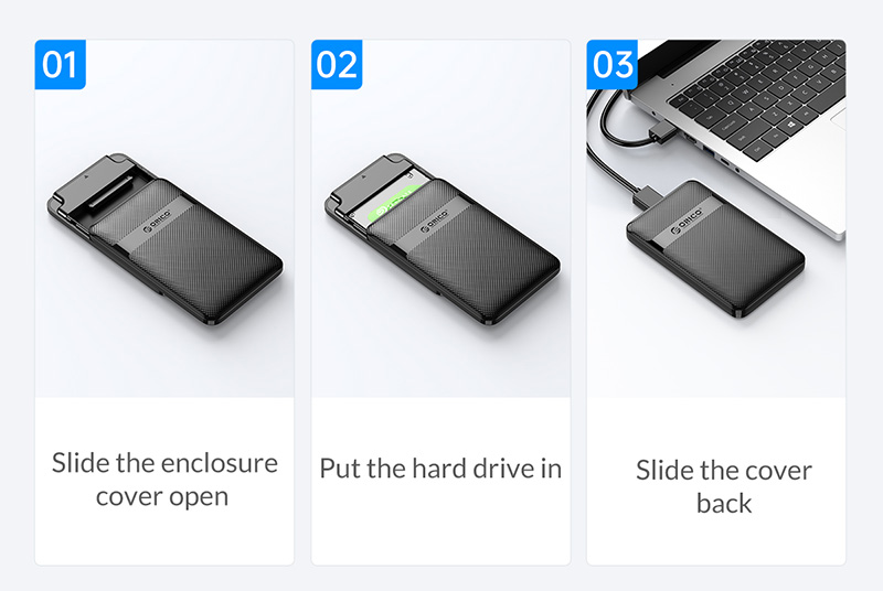 Dễ dàng tháo lắp ổ cứng Được thiết kế độc đáo không ốc vít, Box HDD Orico 2577U3-V1 Super Speed USB3.0 2.5 SATA External Hard Drive Enclosure cho phép bạn gắn ổ cứng HDD hoặc SSD 7-9.5mm 2,5 inch. Không cần công cụ hoặc ốc vít khi tháo ráp. Rất tiện lợi khi phải thay ổ cứng liên tục. Box HDD Orico 2577U3-V1 được trang bị Super Speed USB3.0 cung cấp kết nối đáng tin cậy và băng thông tốc độ lên đến 5Gbps, nhanh hơn 10 lần USB2.0 và tương thích với USB2.0, USB1.1 & USB1.0. Plug and Play, Tất cả bạn cần là cắm vào trong máy tính của bạn, không cần Driver, truy xuất cực nhanh Video, Hình ảnh, Âm nhạc và các tập tin bất kể ở nhà, văn phòng hoặc Studio với bất kỳ máy tính để bàn hoặc máy tính xách tay.