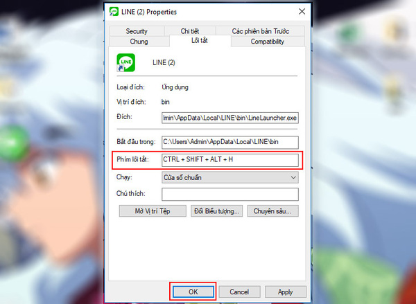 Bước 3: Tại tùy chọn Phím lối tắt, bạn chỉ cần nhập vào tổ hợp phím mà mình muốn → Chọn OK