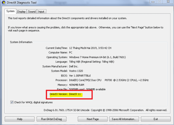 Để kiểm tra xem máy tính của bạn đã cập nhật phiên bản DirectX mới nhất hay chưa, bạn chỉ cần thực hiện qua các bước đơn giản: Nhấn tổ hợp phím Windows + R → gõ từ khóa “dxdiag” vào khung → Chọn OK. Hộp thoại DirectX sẽ được hiện ra, bạn có thể theo dõi bản DirectX tại dòng dưới cùng.