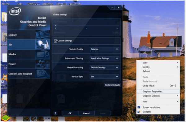 Sau khi đã truy cập vào phần đồ họa 3D, bạn nhấp chuột phải vào màn hình chính → Chọn tiếp vào Graphics Properties (lưu ý: tuỳ vào từng dòng sản phẩm mà sẽ có cách làm khác nhau). Tại Global Setting bạn sẽ thấy phần tùy chỉnh Quality và Performance.