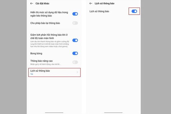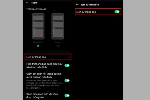 Bước 2: Tiếp đến, bạn chọn vào Lịch sử thông báo →Bật kích hoạt Lịch sử thông báo.