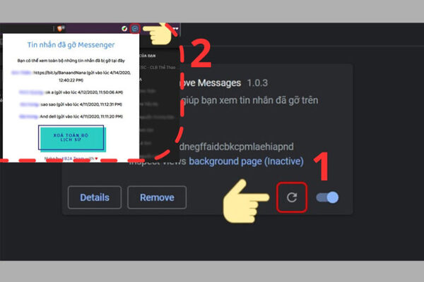 Bước 5: Trở lại màn hình Chrome Extension, bạn click chuột vào biểu tượng refresh để cập nhật tiện ích History Remove Messages.