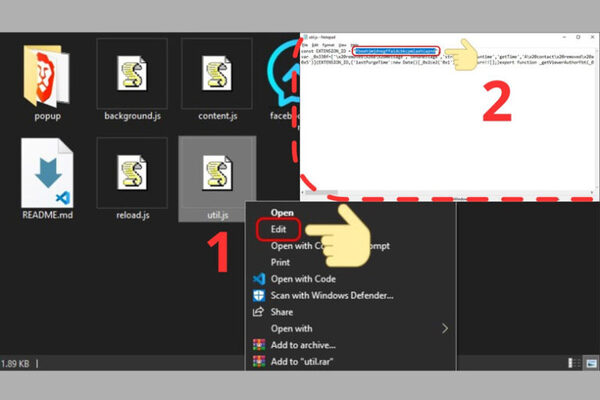Bước 4: Khi giải nén xong file History Remove Messages, bạn chọn vào tệp util.js → Nhấn tiếp vào Edit → Dán vào đó ID đã copy trước đó. Sau đó, nhấn Ctrl + S để lưu lại.