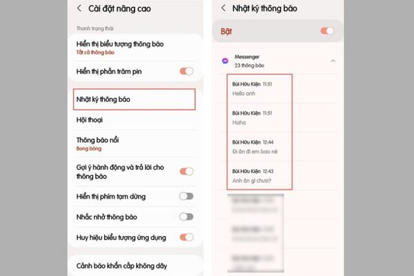 Bước 3: Bạn truy cập vào Nhật ký thông báo để đọc tin nhắn thu hồi. Tuy nhiên, bạn nên bật tính năng Sử dụng nhật ký thông báo lên trước tiên. Bạn chọn vào Messenger để xem lại tin nhắn đã thu hồi từ bạn bè.