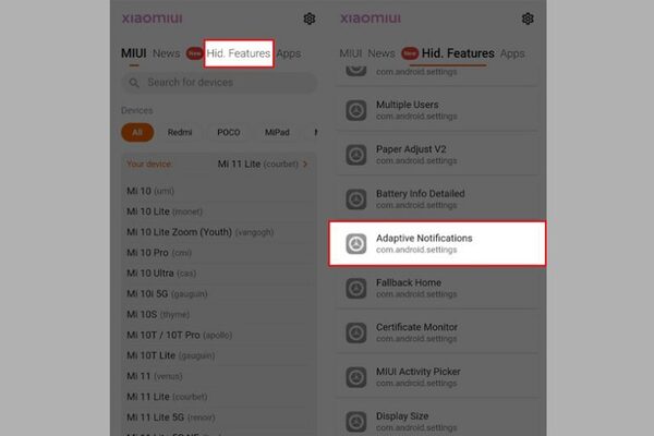 Bước 2: Mở ứng dụng và nhấn chọn Hid. Feartures trong phần chức năng để xem những tính năng chưa được hỗ trợ trên máy. Sau đó, bạn cuộn xuống dưới và tìm đến Adaptive Notifications.