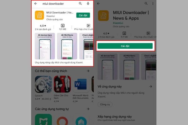Bước 1: Trước tiên, bạn truy cập vào cửa hàng trực tuyến CH Play → Tìm và tải xuống ứng dụng MIUI Downloader hoặc nhấn chọn vào link tải