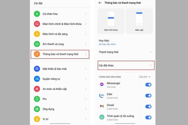 Thông báo và thanh trạng thái → Cài đặt khác