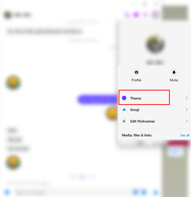 Bước 2: Chọn vào biểu tượng dấu ba chấm ở góc trên cùng bên phải của cửa sổ chat, sau đó chọn "Theme".