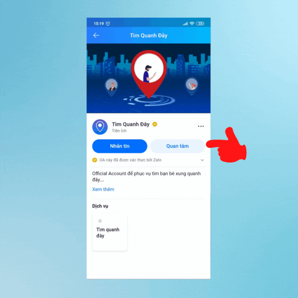Bước 3: Trên trang Official Account "Tìm Quanh Đây", bạn sẽ thấy mục "Quan tâm", nhấn vào để tiếp tục nhé!