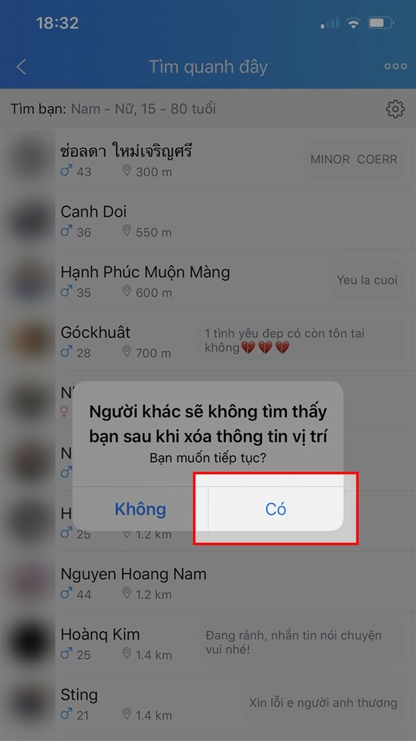 Bước 4: Một cửa sổ thông báo sẽ hiện ra để xác nhận hành động. Chọn "Có" để xác nhận việc tắt tính năng và xóa vị trí của bạn.