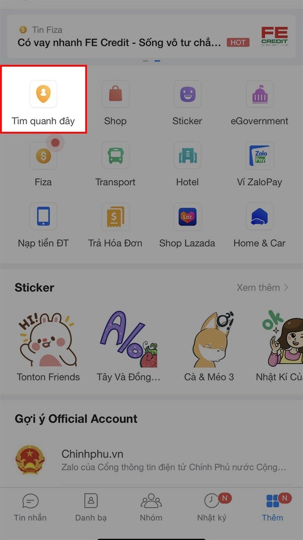 Bước 2: Trên giao diện chính của ứng dụng, sử dụng tính năng tìm kiếm bằng cách nhập từ khóa "Tìm quanh đây" vào thanh tìm kiếm. Tính năng sẽ hiển thị và điều bạn cần làm là chọn vào Official Account "Tìm Quanh Đây".