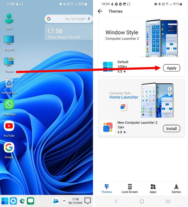 Bước 1: Bạn chọn vào biểu tượng ứng dụng “Theme” → Chọn vào "Apply" tại mục "Default". Bước làm này sẽ chuyển sang Windows 11 trên smartphone.