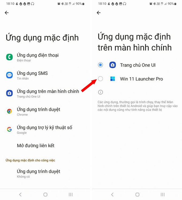 Lưu ý: Trên một số thiết bị Samsung, hệ thống có thể sẽ tự khôi phục lại giao diện mặc định và để giải quyết vấn đề này bạn truy cập vào Cài đặt → Kéo xuống và chọn vào mục “Ứng dụng” → Chọn tiếp vào “Chọn ứng dụng mặc định” → Windows 11 Launcher Pro.