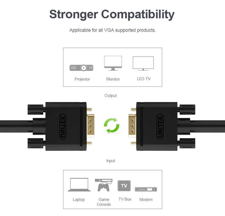 Tương thích cực tốt Cáp chuyển VGA to VGA 1.5m Unitek Y-C503G với tất cả các thiết bị sử dụng cổng VGA như máy tính PC, máy tính xách tay, màn hình, ti vi, máy chiếu,...