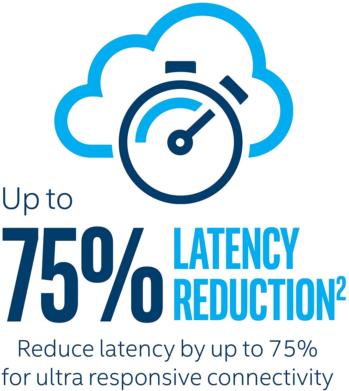 Giảm độ trễ Wi-Fi 6E băng tần kép (802.11ax) giảm độ trễ lên đến 75% so với Wi-Fi 5 (802.11ac). |
