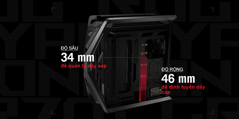 Case máy tính Asus ROG STRIX GR701 HYPERION Black định tuyến các dây cáp chính của bạn qua một kênh duy nhất, cùng với khoảng trống có độ sâu 34mm và một kênh định tuyến cáp rộng 46mm được cố định bằng vài dải velcro để giúp case trông sạch sẽ gọn gàng hơn bao giờ hết.