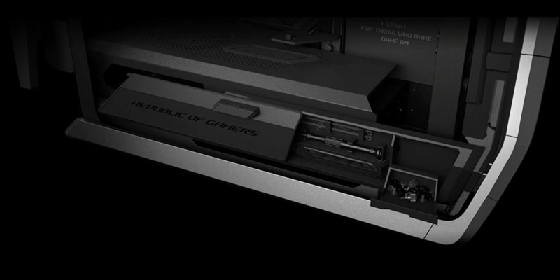 Để giúp việc bảo trì hệ thống trở nên dễ dàng hơn, khung máy của case máy tính Asus ROG STRIX GR701 HYPERION Black có một ngăn lưu trữ tích hợp nhỏ dành cho những thứ như giá đỡ khe cắm PCIe, ốc vít và dây buộc cáp, nhờ đó, các vật dụng thường dùng của bạn luôn ở trong tầm tay dễ dàng.
