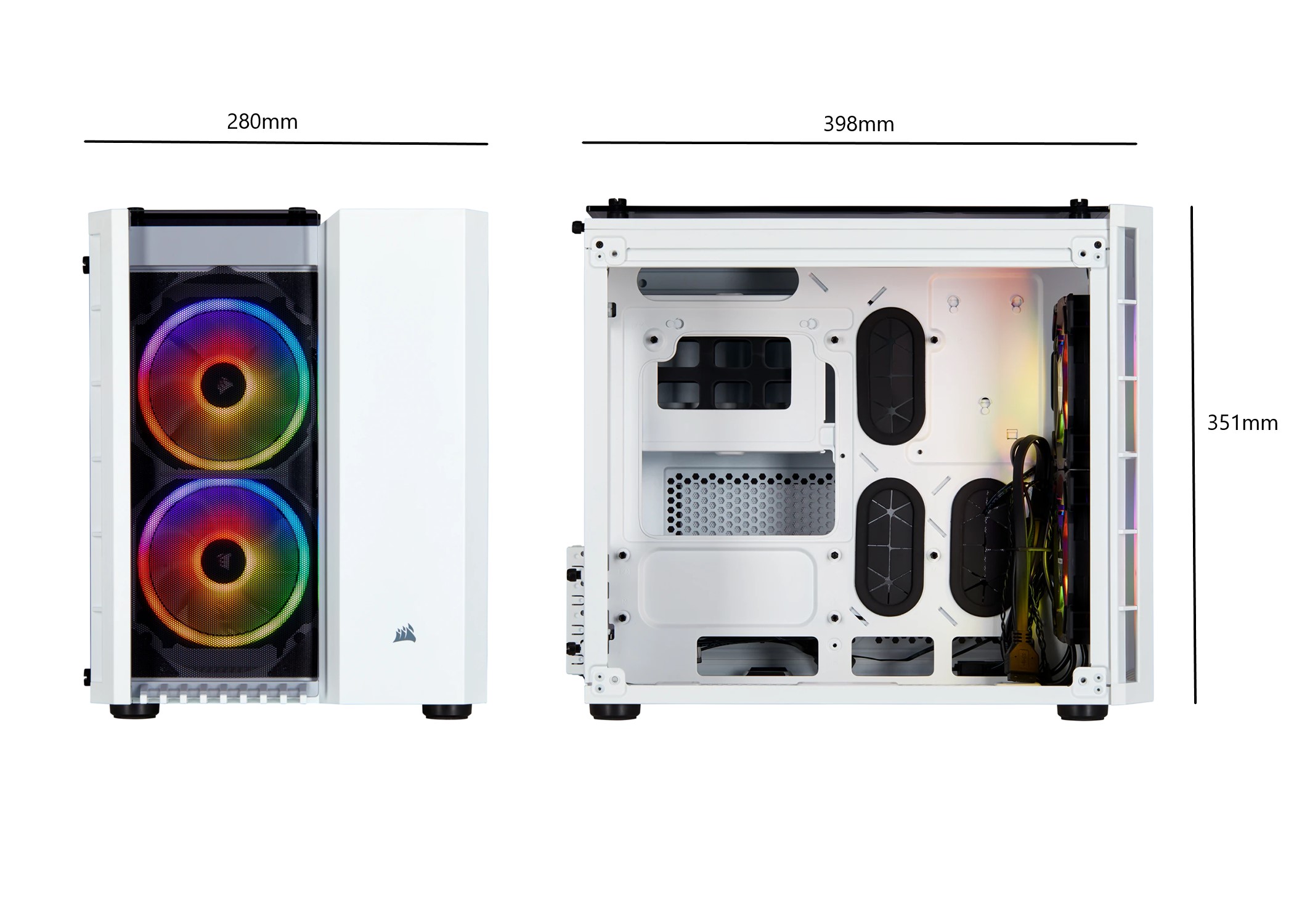 Tăng cường khả năng làm mát Nội thất chứa tối đa sáu Fan 120mm hoặc bộ tản nhiệt 240mm phía trên, bộ tản nhiệt 240mm ở phía trước và bộ tản nhiệt 240mm ở dưới sàn. Bên cạnh 280X còn được trang bị sẵn 2 Fan 120mm với 32 Led RGB có thể tùy chỉnh thông qua Lighting Node Pro hoặc Corsair iCUE. |