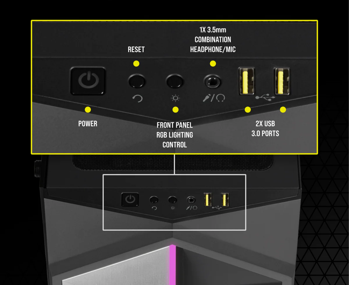 Cổng kết nối Bảng điều khiển I / O mặt trước bao gồm 2x cổng USB Type-A và giắc cắm âm thanh/ micrô kết hợp và nút điều khiển ánh sáng RGB. |