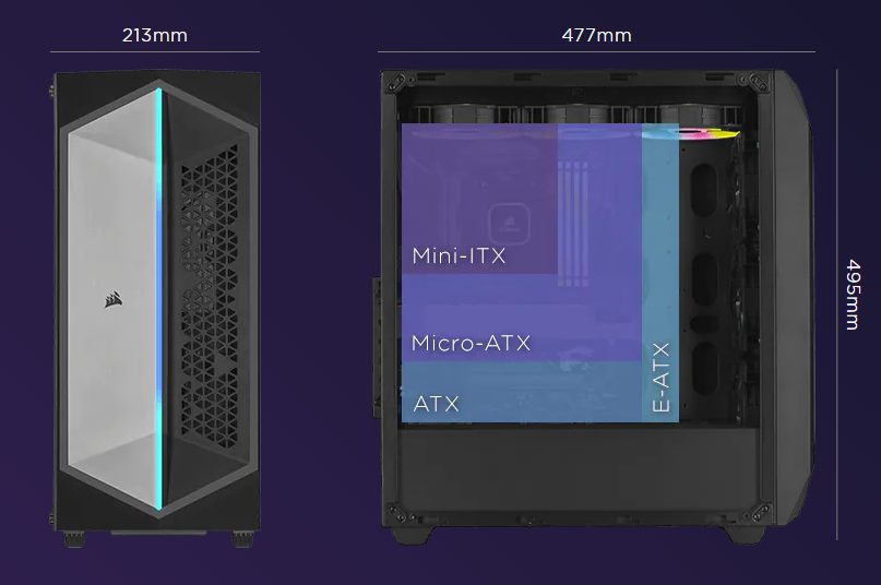 Mặt trước RGB Mang đến vẻ ngoài sắc nét với điểm nhấn là dải đèn RGB tích hợp, với mặt sau bằng lưới cho luồng khí nạp mạnh mẽ. |