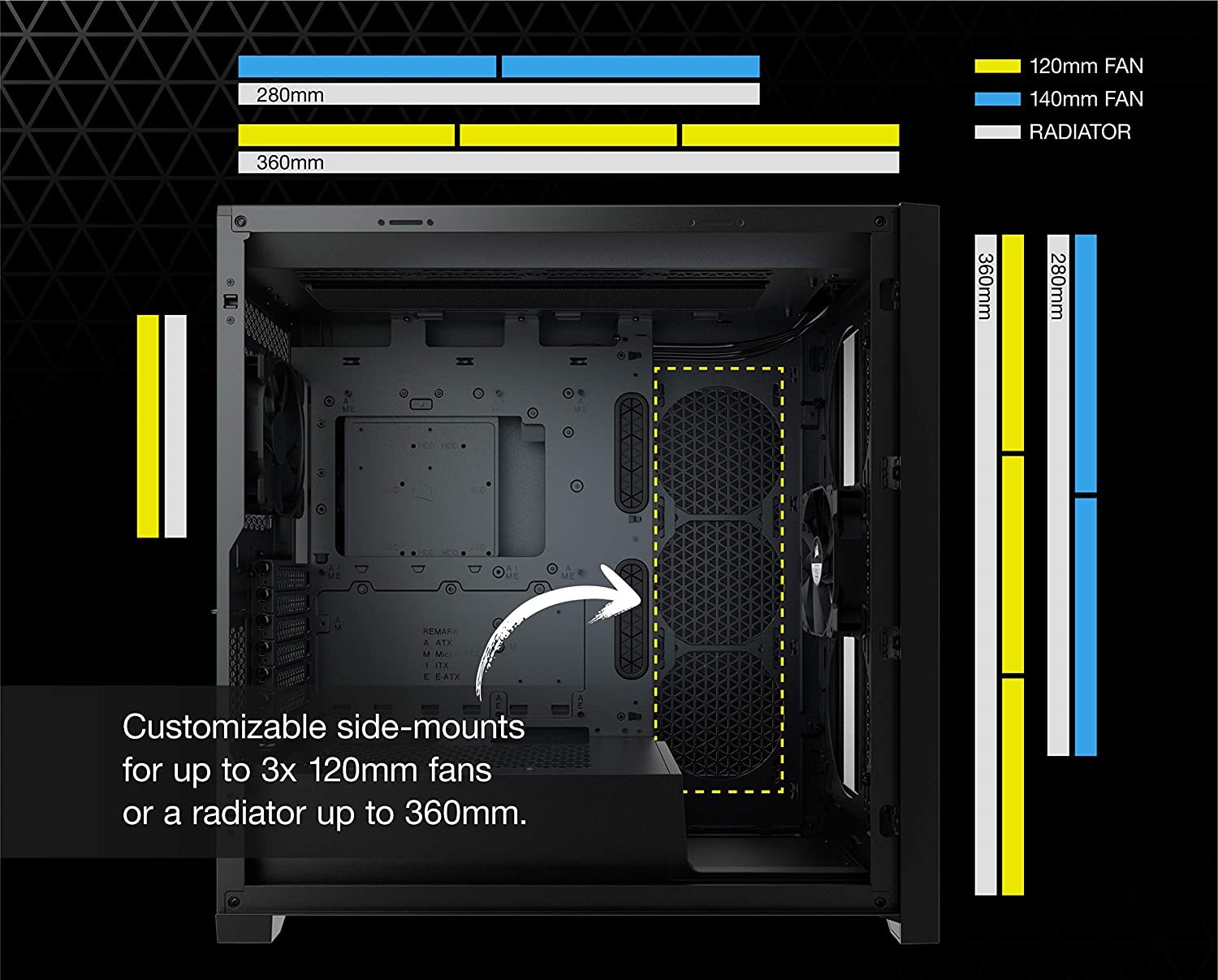 Khả năng không giới hạn Nội thất rộng rãi có thể lắp tối đa 10x 120mm Fan hoặc 4x 140mm Fan, cùng với nhiều bộ tản nhiệt bao gồm 360mm phía trước và 360mm phía trên nóc. |