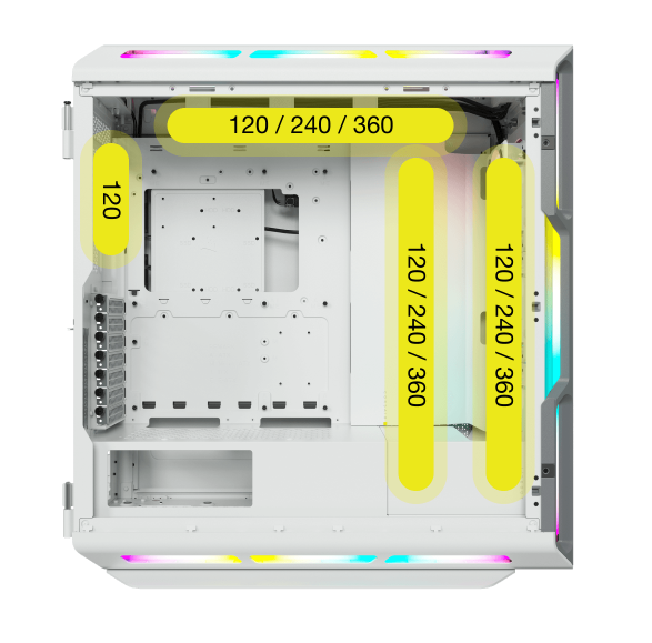 Khả năng không giới hạn Nội thất Case Corsair 5000T RGB TG rộng rãi có thể lắp tối đa 10x 120mm Fan hoặc 4x 140mm Fan, cùng với nhiều bộ tản nhiệt bao gồm 360mm phía trước và 360mm phía trên nóc. |