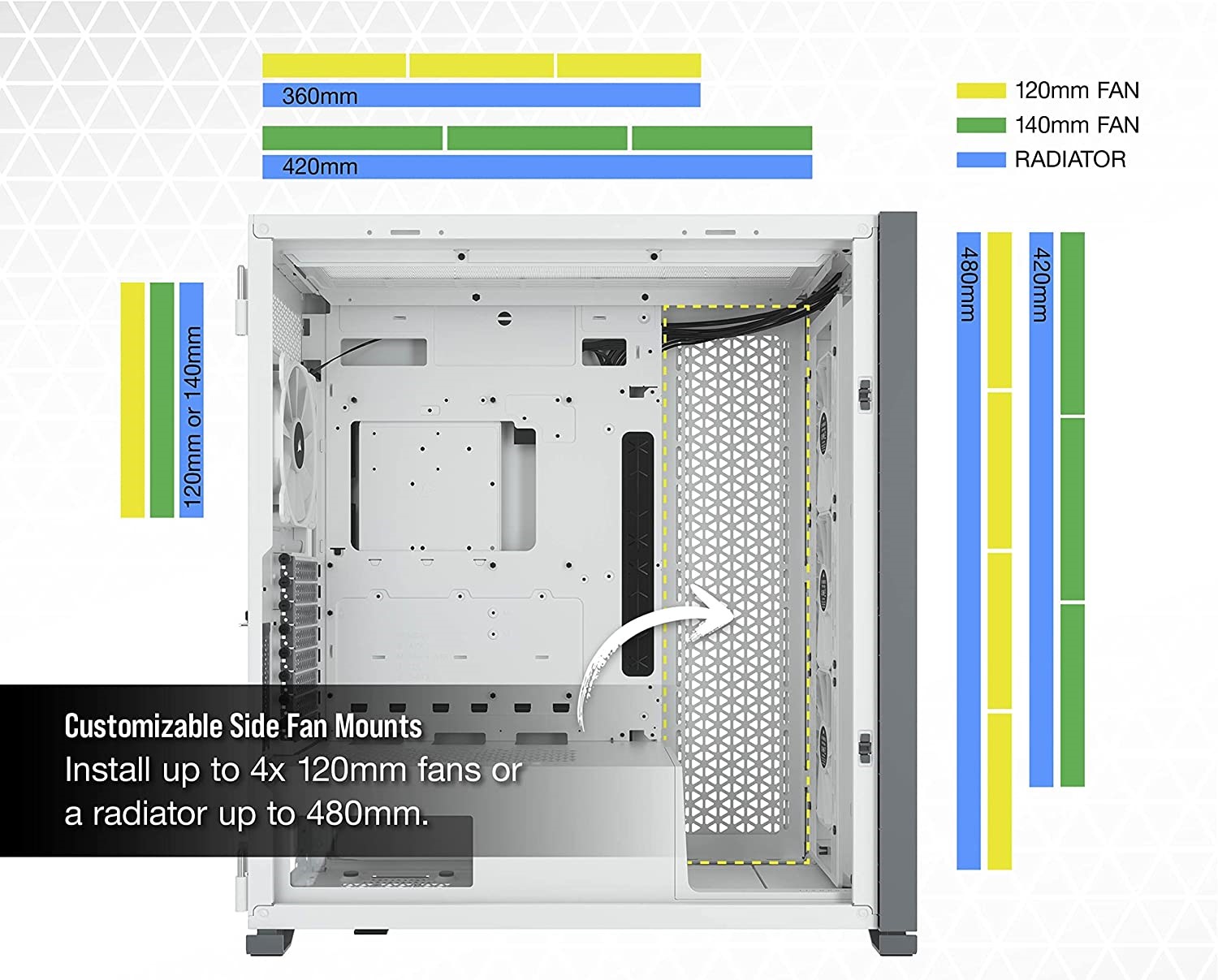 Khả năng không giới hạn 7000X RGB với nột thất rộng rãi, phù hợp với khả năng lắp Fan tối đa lên 12 x 120mm hoặc 7 x 140mm. Ngoài ra có thể lắp lên đến 3 bộ tản nhiệt 360mm hay 2 bộ 420mm, thậm chỉ có thể lắp được bộ 480mm. |
