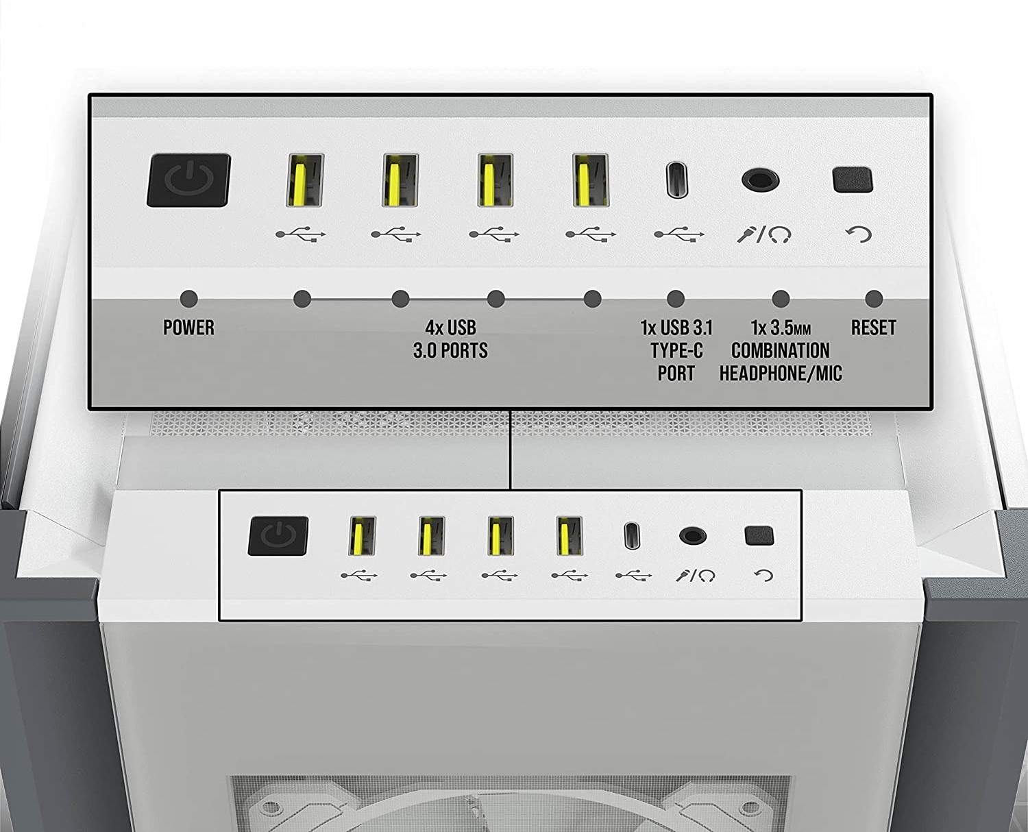 Cổng kết nối Bảng điều khiển I / O mặt trước bao gồm cổng USB 3.1 Type-C, 4 cổng USB 3.0 Type-A và giắc cắm âm thanh/ micrô kết hợp. |