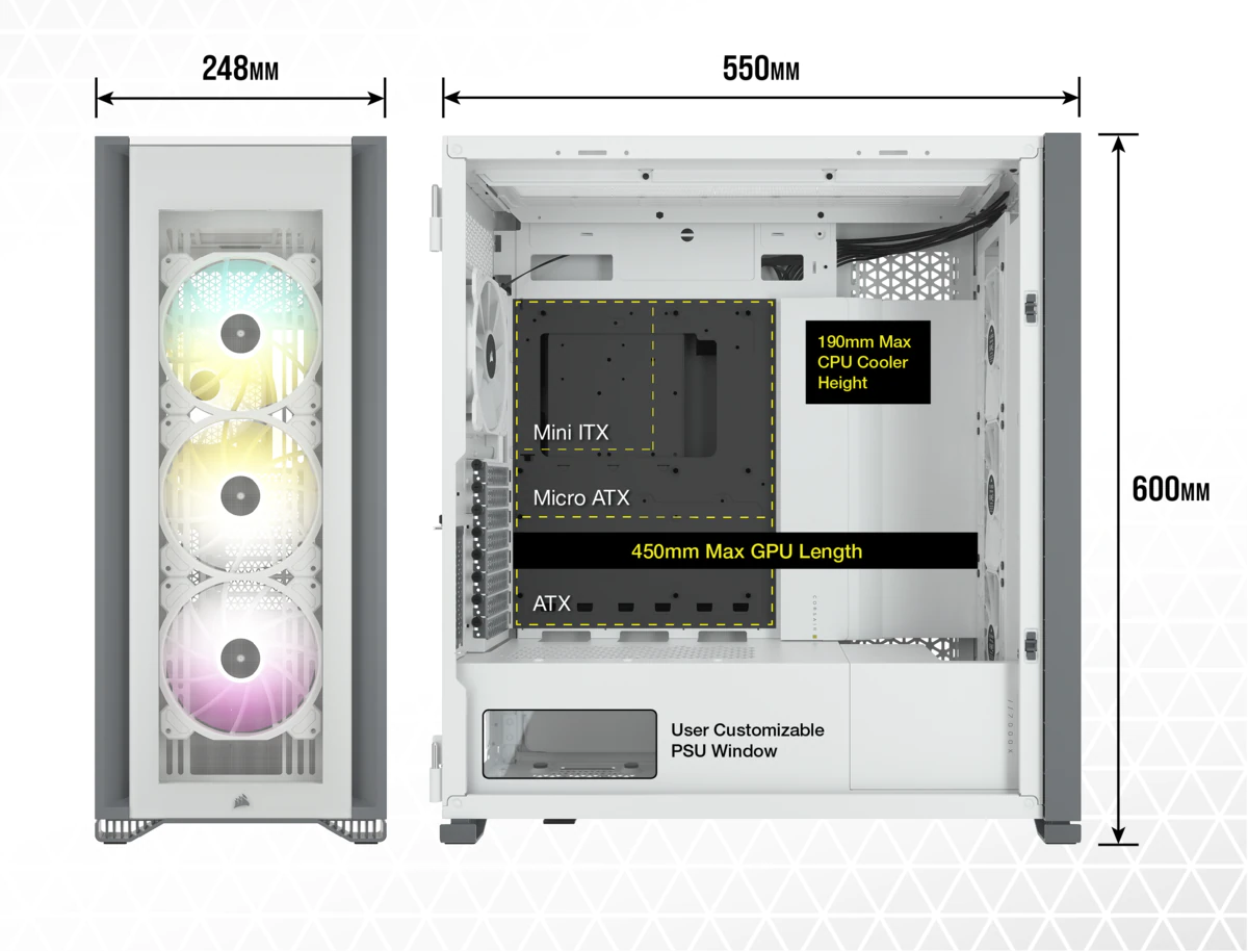 Tăng cường khả năng làm mát Được trang bị bốn Fan CORSAIR 140mm RGB có công nghệ AirGuide với cánh gạt chống xoáy để tập trung luồng không khí và tăng cường khả năng làm mát. |