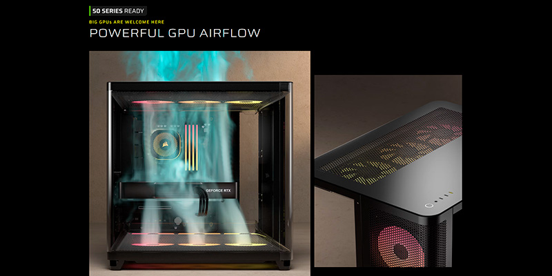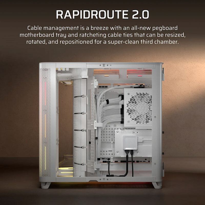 Corsair trang bị cho AIR 5400 LX-R RGB hệ thống RapidRoute 2.0 Cable Management tiên tiến, cho phép sắp xếp dây cáp nhanh chóng và gọn gàng. Với không gian đi dây rộng 134mm, người dùng dễ dàng bố trí dây nguồn, dây dữ liệu và LED RGB một cách khoa học, đảm bảo mặt hiển thị luôn sạch sẽ và thẩm mỹ. Cấu trúc hỗ trợ mainboard đảo cáp (Reverse Connector Motherboard) giúp toàn bộ dây được giấu phía sau, tạo không gian nhìn tinh tế và tối ưu luồng gió bên trong case.