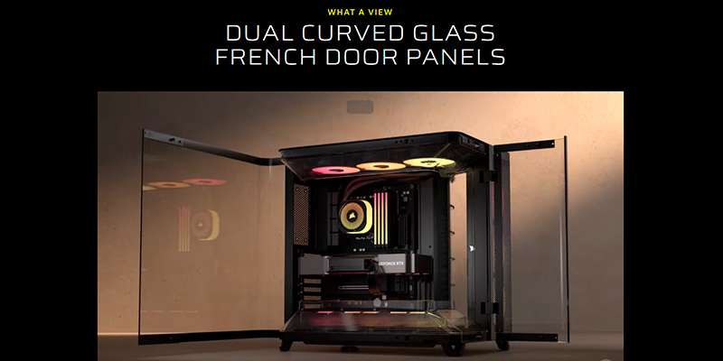 Corsair AIR 5400 LX-R RGB White được thiết kế với hai tấm kính cong dạng cửa đôi (French Door Design), mang đến tầm nhìn toàn cảnh tuyệt đẹp vào toàn bộ linh kiện bên trong. Thiết kế này không chỉ giúp người dùng dễ dàng thao tác khi lắp đặt mà còn tôn lên vẻ sang trọng của các linh kiện cao cấp như GPU, RAM RGB hay tản nhiệt nước AIO. Chất liệu kính cường lực trong suốt, viền mảnh cùng bộ khung thép đen mờ giúp tăng độ chắc chắn, vừa mang tính thẩm mỹ vừa thể hiện đẳng cấp build hiện đại.