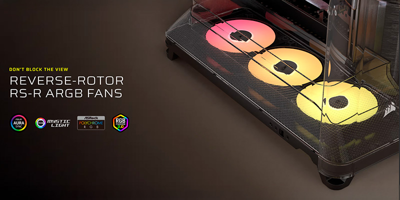 Corsair trang bị cho AIR 5400 RS-R ARGB ba quạt RS-R ARGB 120mm với thiết kế cánh đảo chiều (Reverse Rotor), giúp ánh sáng RGB hiển thị đều và rực rỡ từ mọi góc nhìn. Hệ thống ARGB 16.8 triệu màu có thể đồng bộ với các phần mềm như ASUS Aura Sync, MSI Mystic Light, Gigabyte RGB Fusion hoặc Corsair iCUE, cho phép tùy chỉnh hiệu ứng ánh sáng linh hoạt. Ngoài tính thẩm mỹ, các quạt còn đảm bảo luồng gió mạnh và độ ồn thấp, giữ cho toàn bộ linh kiện vận hành ổn định, mát mẻ ngay cả trong quá trình tải nặng.