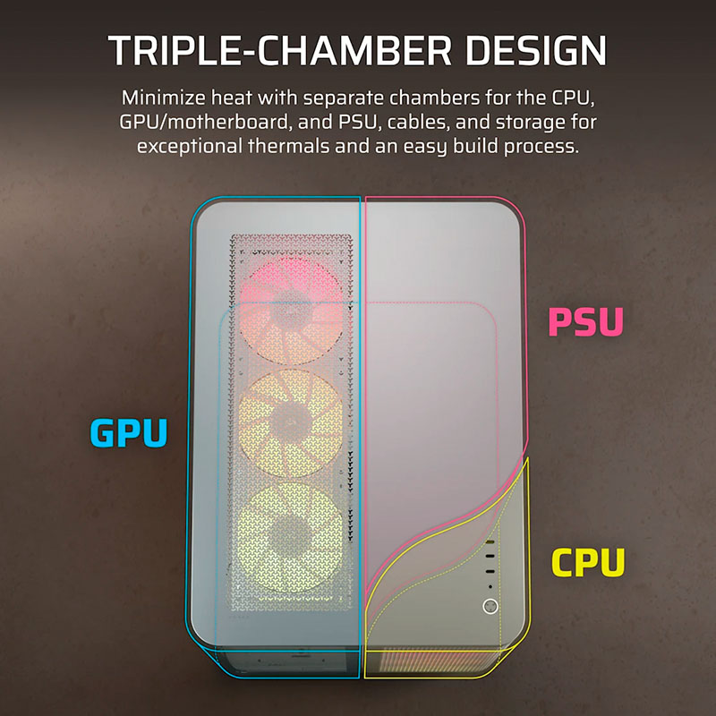 Case máy tính Corsair AIR 5400 RS-R ARGB Triple Chamber White CC-9011319-WW sở hữu thiết kế ba khoang tách biệt (Triple Chamber) giúp phân chia khu vực mainboard, nguồn và lưu trữ một cách khoa học. Cấu trúc này không chỉ giúp tăng cường hiệu quả tản nhiệt mà còn đảm bảo dây cáp được giấu gọn gàng, mang lại vẻ ngoài tinh tế và sạch sẽ cho hệ thống. Khung case được làm từ thép chắc chắn kết hợp với kính cường lực cao cấp, tạo nên phong cách hiện đại và mạnh mẽ cho mọi dàn PC cao cấp.