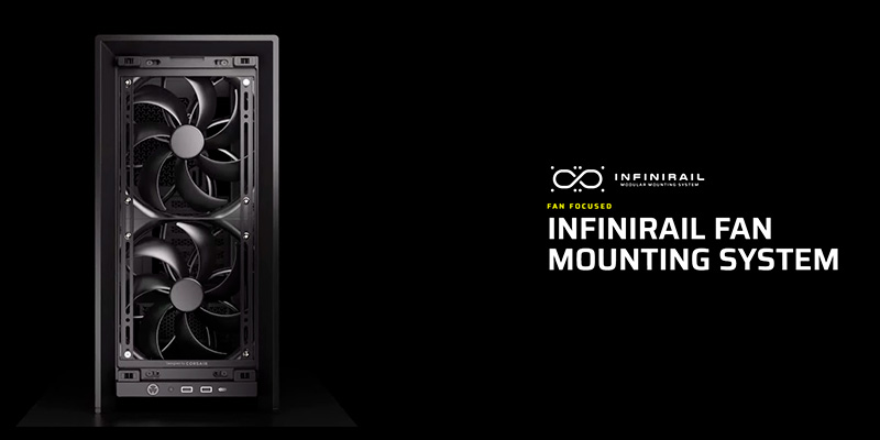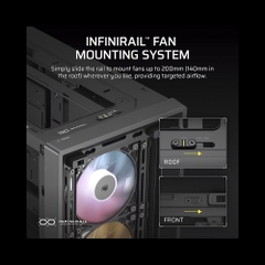 Corsair FRAME 4000D RS ARGB Airflow Black được trang bị hệ thống InfiniRail™ Fan Mounting, cung cấp khả năng lắp đặt quạt linh hoạt và dễ dàng. Bạn có thể điều chỉnh vị trí quạt lên đến 200mm ở mặt trước và 140mm ở phía trên, đảm bảo luồng không khí tối ưu cho các linh kiện bên trong. Hệ thống này giúp tăng hiệu suất làm mát và kéo dài tuổi thọ cho các thành phần quan trọng của máy tính.