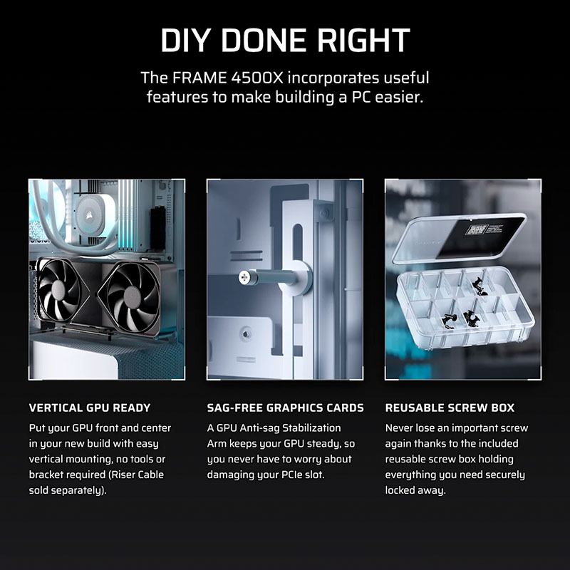 Corsair trang bị cho FRAME 4500X hệ thống InfiniRail™ Fan Mounting, cho phép người dùng tùy chỉnh vị trí gắn quạt hoặc radiator linh hoạt chỉ bằng vài thao tác đơn giản mà không cần dùng đến công cụ phức tạp. Đây là tính năng cực kỳ tiện lợi cho người thích build PC cá nhân hóa, giúp tiết kiệm thời gian lắp đặt mà vẫn đảm bảo bố cục gọn gàng, chuyên nghiệp. Ngoài ra, sản phẩm còn tích hợp GPU Anti-sag Stabilization Arm, giúp giữ card đồ họa luôn vững chắc, tránh võng hay cong khi sử dụng card kích thước lớn.