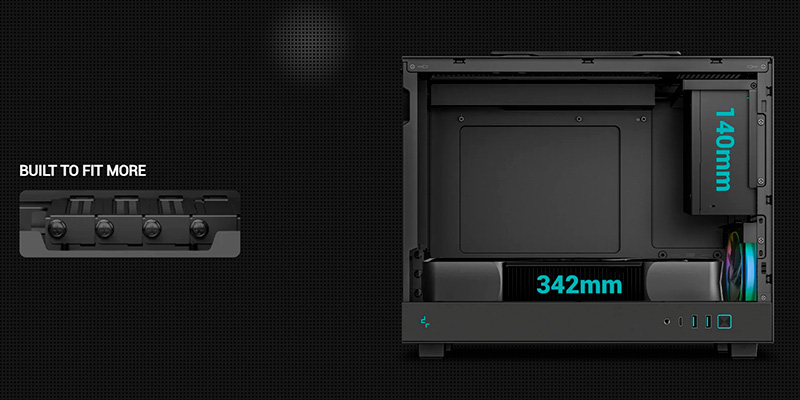 Không chỉ dừng lại ở thiết kế nhỏ gọn, DeepCool CH160 PLUS Black R-CH160-BKNGM0-G còn hỗ trợ card đồ họa 3-slot, giúp người dùng dễ dàng trang bị các dòng VGA cao cấp như RTX 4070/4060 Ti. Với khe cắm Micro-ATX, người dùng có thể mở rộng hệ thống với nhiều khe PCIe hơn so với các case ITX truyền thống. Ngoài ra, khả năng lắp nguồn ATX chuẩn PS2 dài đến 140mm là điểm cộng lớn, cho phép chọn nhiều dòng PSU công suất lớn mà không cần giới hạn trong chuẩn SFX.