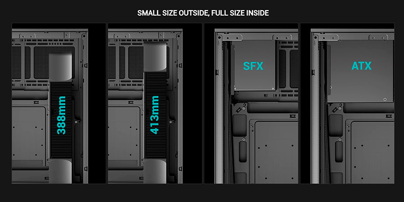 Dù có thiết kế nhỏ gọn, CH270 Digital vẫn hỗ trợ card đồ họa dài đến 388mm (hoặc lên đến 413mm nếu không gắn quạt phía trên), tản nhiệt khí CPU cao tối đa 174mm, và nguồn ATX PS2 chuẩn với chiều dài đến 150mm. Người dùng có thể lắp đặt các linh kiện mạnh mẽ mà không lo về giới hạn kích thước.