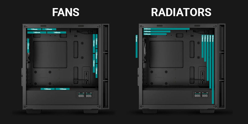 Case máy tính Deepcool CH360 Digital ARGB hỗ trợ lắp đặt tối đa 8 quạt 120mm hoặc 4 quạt 140mm, cũng như đủ lớn cho những bộ tản nhiệt nước AIO 240mm/360mm, đáp ứng nhu cầu tản nhiệt cho hệ thống cao cấp.