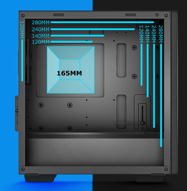 Tăng khả năng làm mát Hỗ trợ lên đến sáu Fan 120mm hoặc bốn Fan 140mm và cả bộ tản nhiệt lên đến 280mm được lắp ở phía trên hoặc phía trước. Ngoài ra MACUBE 110 còn khe 165mm để phù hợp với bộ tản nhiệt nước. |