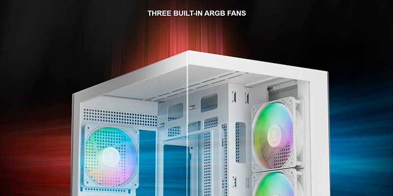 Điểm sáng của case Gamdias AURA GC10M WH ARGB là hệ thống 3 quạt làm mát ARGB đi kèm sẵn được bố trí thông minh để tối ưu luồng gió trong thùng máy. Hiệu ứng đèn ARGB đồng bộ nổi bật giúp case không chỉ mát mẻ mà còn rực rỡ theo từng cú click qua hub điều khiển hoặc phần mềm mainboard tương thích.