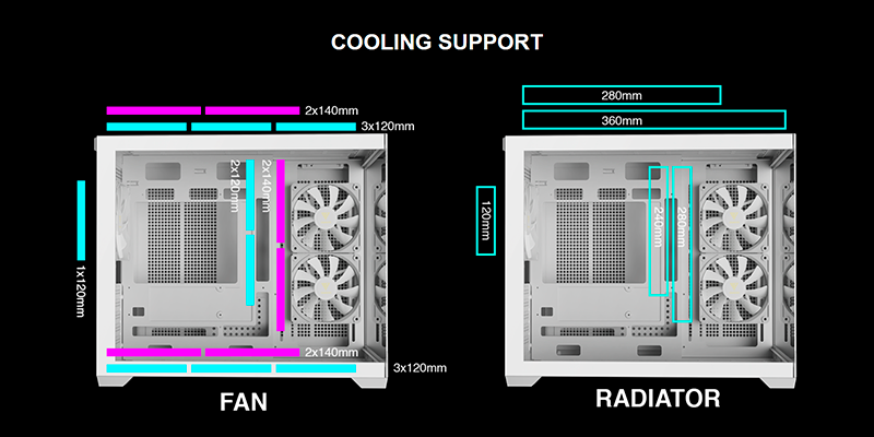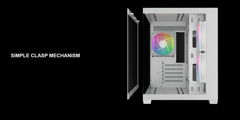 Mặt bên được làm bằng kính cường lực trong suốt, bền chắc, giúp bạn dễ dàng khoe trọn hệ thống đèn RGB, layout linh kiện gọn gàng và tạo điểm nhấn hiện đại cho góc máy. Dù là fan của RGB hay người yêu thích không gian tối giản, chiếc case này đều giúp bạn thể hiện phong cách cá nhân một cách tinh tế.