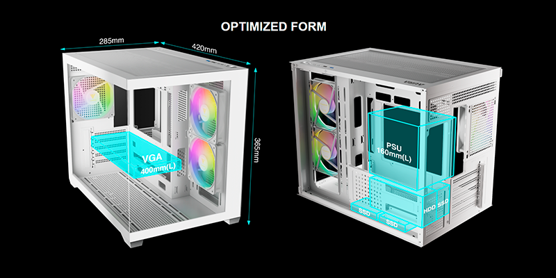 Với chuẩn kích thước micro-tower, case hỗ trợ đa dạng mainboard từ Micro-ATX, Mini-ITX cho đến Mini-DTX. Người dùng có thể dễ dàng lắp đặt các linh kiện cao cấp như card đồ họa dài đến 400mm, tản nhiệt CPU cao 165mm hoặc hệ thống tản nhiệt nước đa tầng. Đây là lựa chọn lý tưởng cho cả builder chuyên nghiệp lẫn người dùng phổ thông muốn nâng cấp hiệu năng lâu dài.