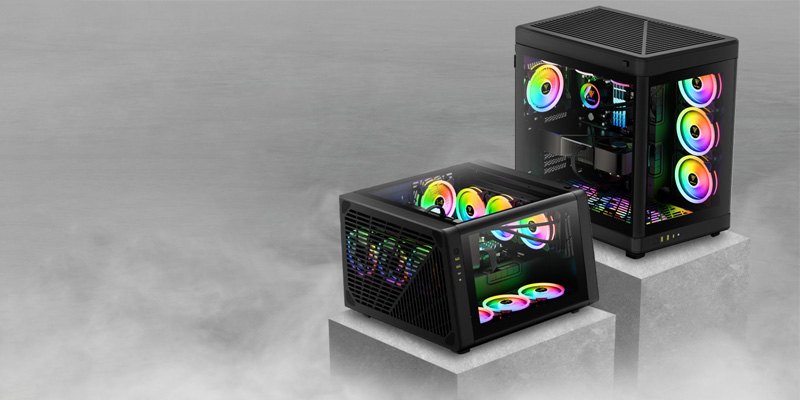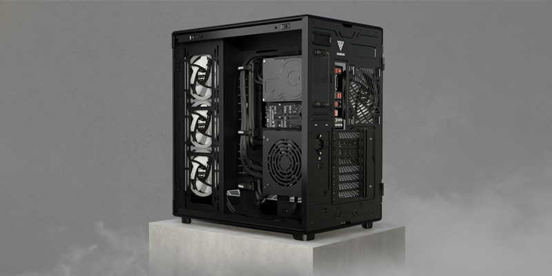 Case máy tính Gamdias NESO P1 B có các khe cắm PCIe xoay 8x8 và không gian bên trong lên tới 426mm cho phép lắp đặt linh hoạt các GPU ngang và dọc lên đến dòng RTX 40.