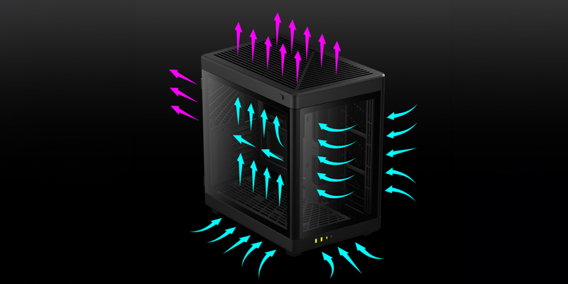 Thông qua các tấm lưới được đục lỗ hoàn toàn xung quanh vỏ, NESO P1 cung cấp các tuyến luồng khí tối ưu và vô số tùy chọn để định cấu hình luồng khí nạp và xả trong khi sử dụng hướng vỏ mô-đun.