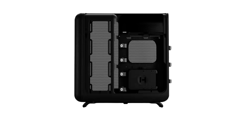 Khả năng tản nhiệt của HYTE X50 Air được nâng lên một tầm cao mới nhờ công nghệ làm mát sàn lạnh (Cold-Floor Cooling) độc đáo. Hệ thống này cho phép lắp đặt tới 3 quạt 120mm cực dày (lên đến 32mm) ở phía dưới đáy, tạo ra luồng khí tươi trực tiếp thổi thẳng vào card đồ họa để giữ cho GPU luôn mát mẻ và thoải mái ngay cả khi hoạt động ở cường độ cao. Bên cạnh đó, vỏ máy còn được trang bị hệ thống thông gió cánh gạt dạng cửa chớp đang chờ cấp bằng sáng chế (Patent-Pending Louvered Blade Ventilation). Các cánh gạt này giúp giảm trở kháng xả khí bằng cách cắt xuyên qua luồng khí nóng, đẩy nhiệt lượng ra ngoài hiệu quả hơn, đồng thời đóng vai trò gia cố độ cứng cáp cho khung máy (chassis rigidity), đảm bảo sự vững chãi cho toàn bộ cấu trúc.