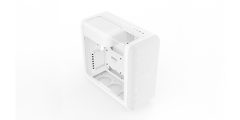 Việc đi dây gọn gàng trở nên dễ dàng hơn bao giờ hết nhờ vào thiết kế mái che nguồn có cấu trúc (Structural PSU Canopy) được bố trí thông minh. Khu vực này cung cấp không gian rộng rãi để giấu các dây cáp thừa, kết hợp với các điểm buộc dây được đặt tỉ mỉ và dây đai velcro đi kèm, giúp khoang máy luôn sạch sẽ và thoáng đãng để luồng khí lưu thông tốt nhất. Mặt trước của case được trang bị đầy đủ các cổng kết nối hiện đại, bao gồm 1 cổng USB 3.2 Gen 2x2 Type-C tốc độ cao và 2 cổng USB 3.2 Gen 1 Type-A, cùng giắc cắm âm thanh combo 3.5mm. Nút nguồn cơ học xúc giác (Tactile Mechanical Power Switch) tích hợp đèn LED không chỉ mang lại cảm giác bấm thỏa mãn mà còn là điểm nhấn tinh tế, hoàn thiện trải nghiệm sử dụng cao cấp cho người dùng.