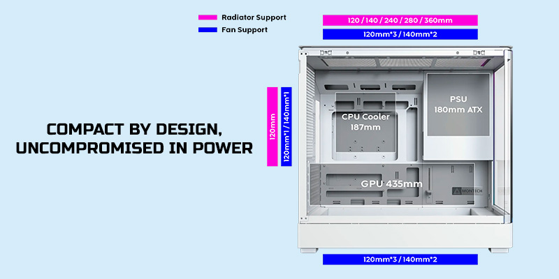 Dù có kích thước 450 x 245 x 423mm, KING 15 PRO vẫn tương thích hoàn hảo với tản nhiệt CPU cao đến 187mm, GPU dài tối đa 435mm, và nguồn ATX 180mm. Đặc biệt, sản phẩm hỗ trợ radiator 360mm gắn trên đỉnh máy, thậm chí với độ dày tối đa lên đến 84mm, đảm bảo hiệu quả làm mát vượt trội ngay cả khi kết hợp với hệ thống tản nhiệt nước cao cấp. Điều này mang lại sự linh hoạt tuyệt đối cho người dùng muốn xây dựng dàn PC hiệu năng cao trong không gian nhỏ gọn.